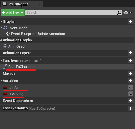 3. Open up your animation blueprint. Let us begin by defining some of the variables and functions that will be required. Make a function called CastToCharacter. This function will retrieve your FirstPersonCharacter blueprint and extract some of its parameters required for animations (Velocity and IsFlying). Create the variables IsInAir and IsMoving as well.