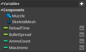 4. Create variables for our weapon. ReloadTime (float), BulletSpread (float), AmmoCount (int), and MaxAmmo are all required (int). Integer is a whole number, whereas float is a number separated by a comma.