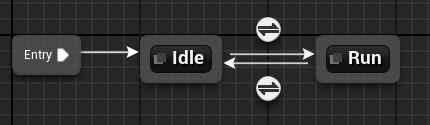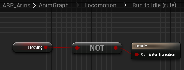 9. Let's connect those nodes and define the rules. First, connect the entry to idle, which will play as the default. Then connect idle to run and vice versa. Select the rules by clicking on the transition buttons. To play the running animation, we obviously need the player to move. Take the IsMoving variable and make it the rule. We need an opposite rule to transition from run to idle, so we simply add a NOT node.