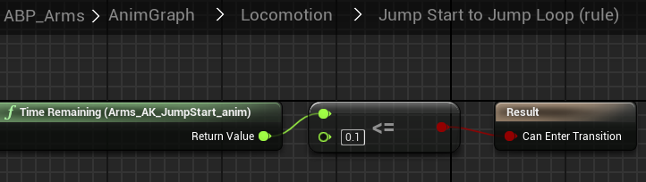 11. We need to check the remaining time of the previous animation from Jump start to Jump loop. We will use the Time remaining node. If there isn't much time left before the animation ends, we'll move on to the next (If our jump start animation is ending we are transitioning to jump loop animation).